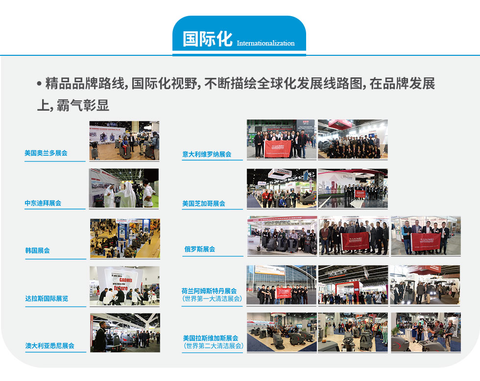 高美能夠為各類商業(yè)或工業(yè)區(qū)域,提供專業(yè)的清潔解決方案。公司主要產(chǎn)品為:洗地機系列、掃地車系列、洗掃一體機系列、商業(yè)機系列。產(chǎn)品遠銷北美、歐洲、澳洲、中東和東南亞等世界各地,深受廣大用戶的歡迎和信賴。