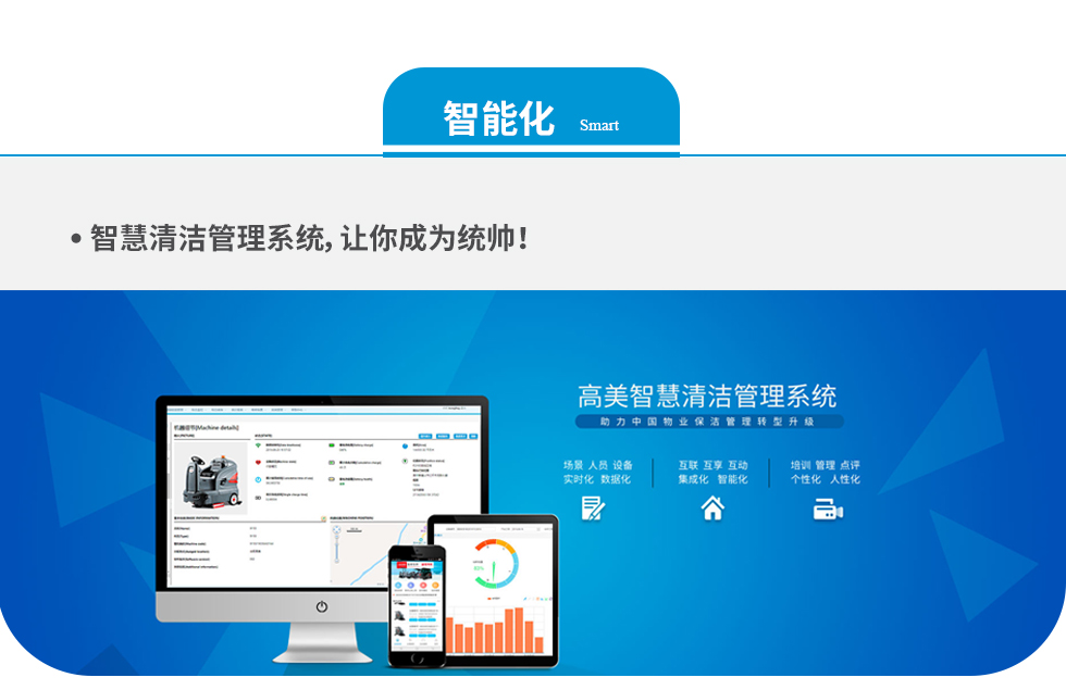 高美,著力打造代表行業(yè)高端專業(yè)化的智慧清潔體驗館。高美智慧清潔管理系統(tǒng)和高端清潔設備,實現(xiàn)場景、人員、設備實時化和數(shù)據(jù)化,結合互聯(lián)網(wǎng)和大數(shù)據(jù),打造數(shù)據(jù)平臺,讓數(shù)據(jù)賦能企業(yè)。高美以應有的使命和擔當,引領行業(yè)新一輪智能化潮流,為行業(yè)發(fā)展貢獻高美方案。