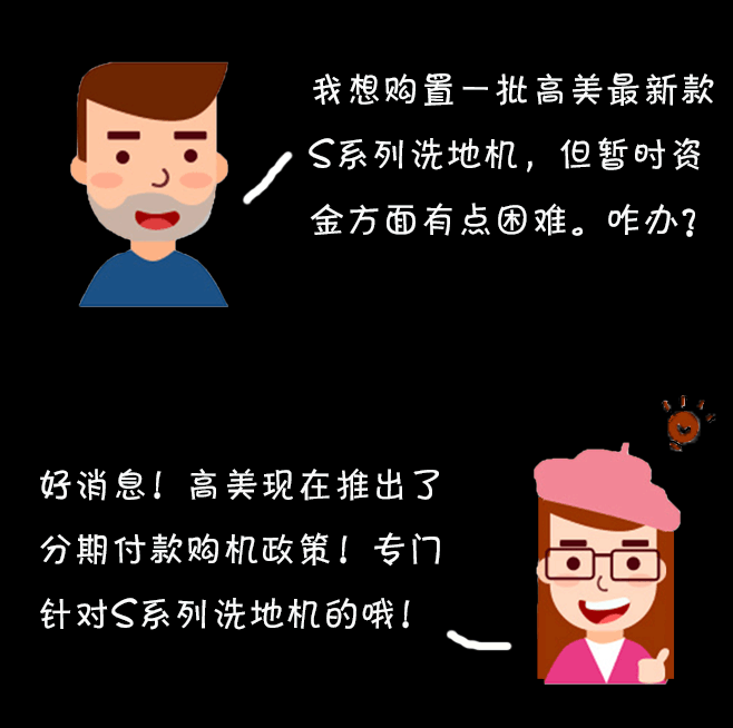 我想購置一批高美最新款S系列洗地機(jī),但暫時資金方面有點困難。該如何是好?好消息!高美現(xiàn)在正好推出了分期付款購機(jī)政策!就是專門針對S系列洗地機(jī)的哦!
