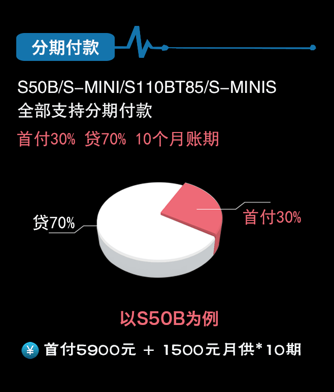 S50B/S-MINI/S110BT85/S-MINIS全部支持分期付款首付30% 貸70% 10個月賬期以S50B為例首付5900元 + 1500元月供*10期