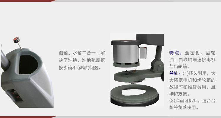 5. 增配環(huán)形加重塊,重量達70kg,配合2HP強大馬力,可專業(yè)晶面處理石才。泡箱、水箱二合一,解決了洗地、洗地毯需拆換水箱和泡箱的問題。 特點:全密封、齒輪油;由聯(lián)軸器連接電機與齒輪箱。