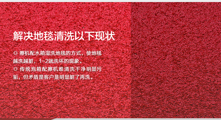 2.解決了擦機配水箱濕洗地毯的方式,使地毯越洗越臟,1-2年就洗壞的現(xiàn)象。
